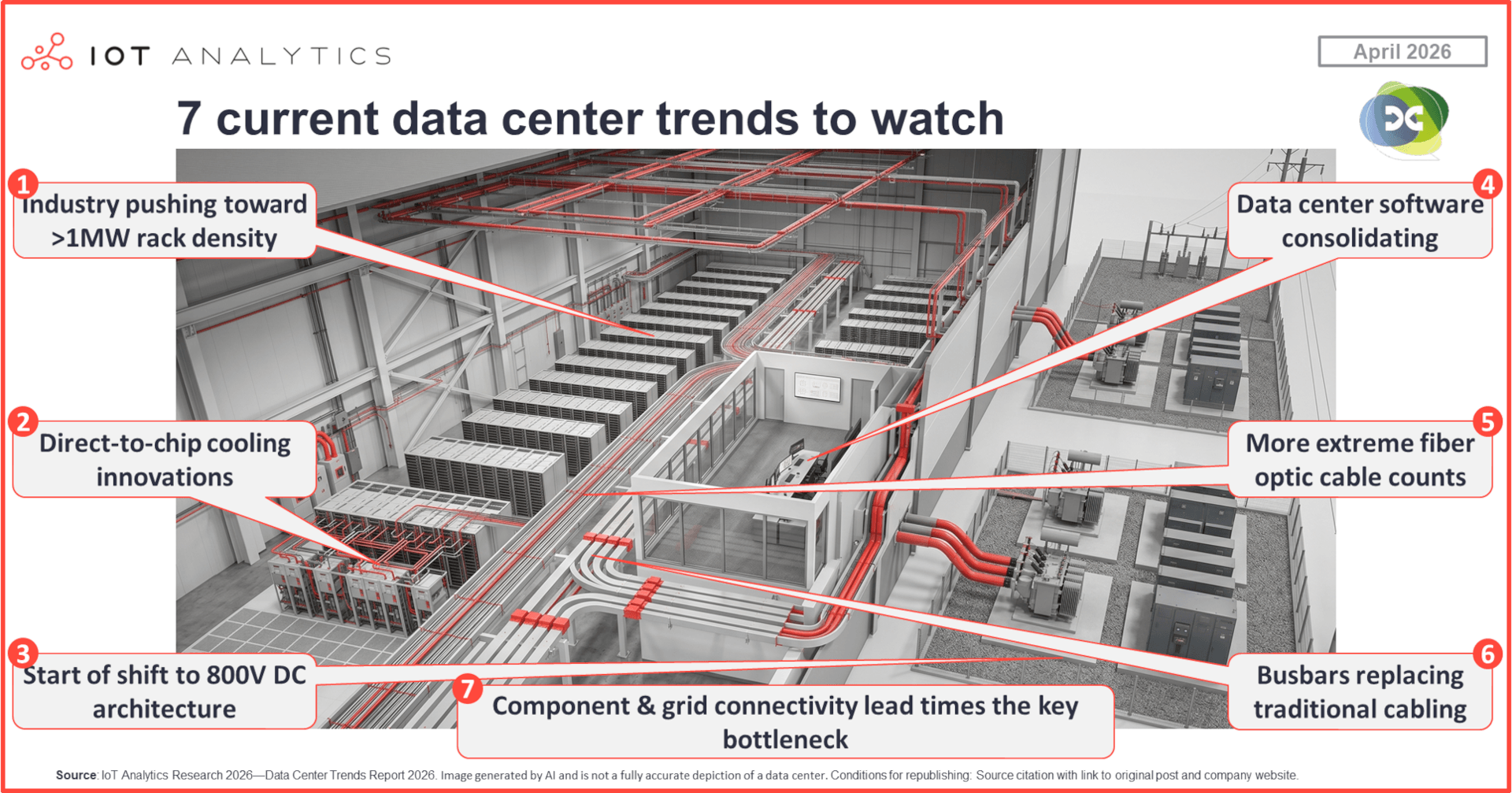 IoT Analytics analysts were on the ground to investigate the latest trends and challenges, producing a 36-page event report—Data Center Trends Report 2026—with 26 data center trends drawn from discussions and observations at Data Centre World London 2026. Below, the team shares 7 of these 26 trends.