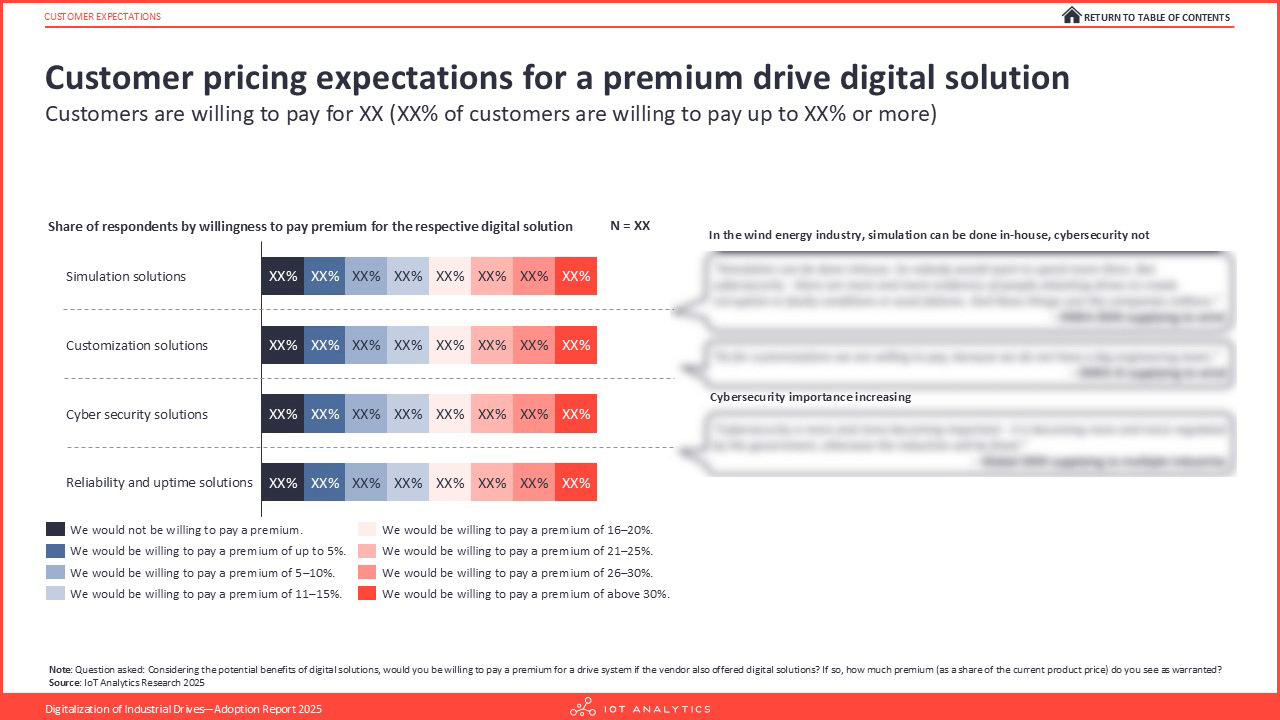 - Customer expectations: Analyzes customer requirements for manufacturer support across simulation, customization, reliability & uptime, and cybersecurity. It also examines customer pricing expectations for premium digital solutions.