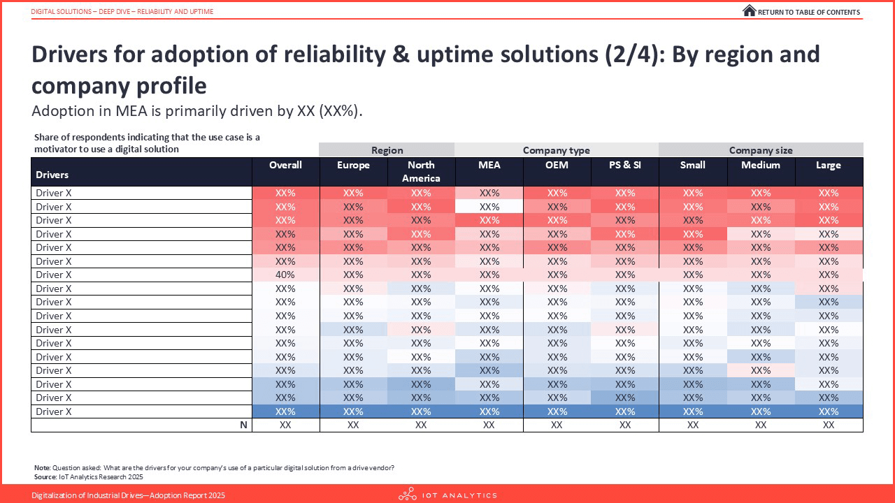 - Reliability & uptime solutions deep dive: Analyzes 8 digital reliability and uptime solutions. The section outlines common data collection methods from drive systems and examines the issues faced when integrating third-party condition monitoring solutions.