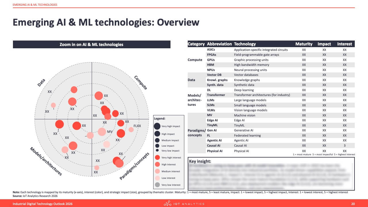 A 112-page report analyzing 60+ emerging industrial technologies across AI & ML, Automation & Robotics, IoT Connectivity, and Cloud & Software.