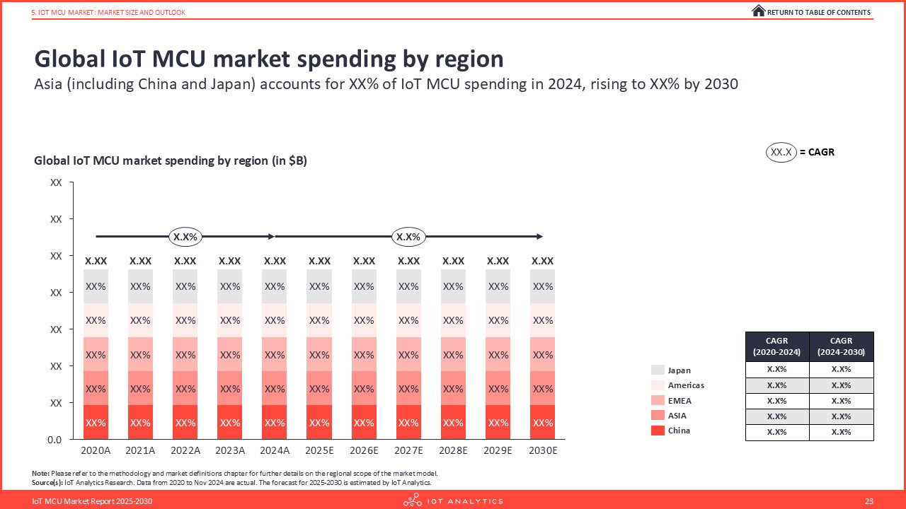 - Detailed market sizing and forecast: A granular look at the IoT MCU market size through 2030, with breakdowns by region