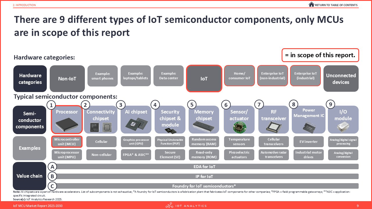- There are 9 different types of IoT semiconductor components, only MCUs are in scope of this report