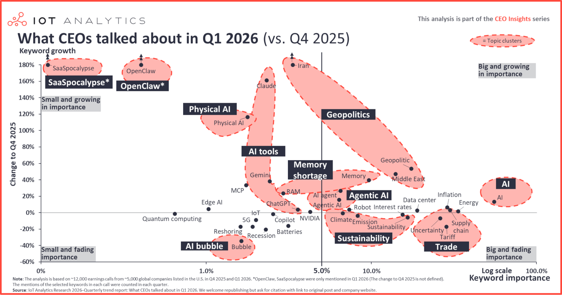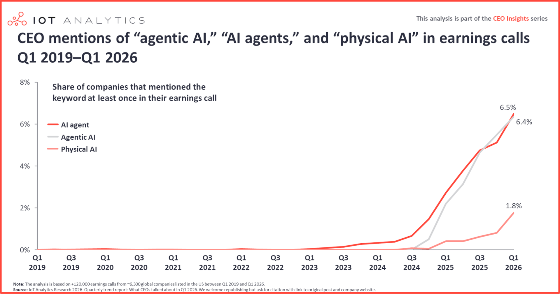 The Quarterly trend report: What CEOs talked about in Q1 2026 is part of IoT Analytics’ ongoing coverage of the IoT and related technology markets. The information presented in this report is based on a database of 120,000+ earnings calls of US-listed companies from Q1 2019 through Q1 2026. Every quarter, IoT Analytics analyzes trends emerging from earnings calls and presents findings for the most recent quarter. The purpose is to inform other market participants about the current focus of CEOs and companies. To ensure objectivity, IoT Analytics did not alter or supplement any results and did not deliberately exclude any earnings calls.