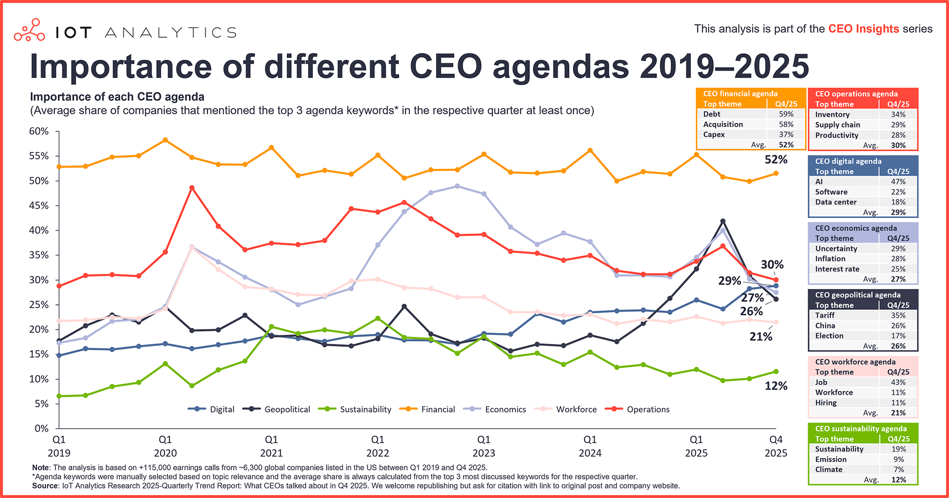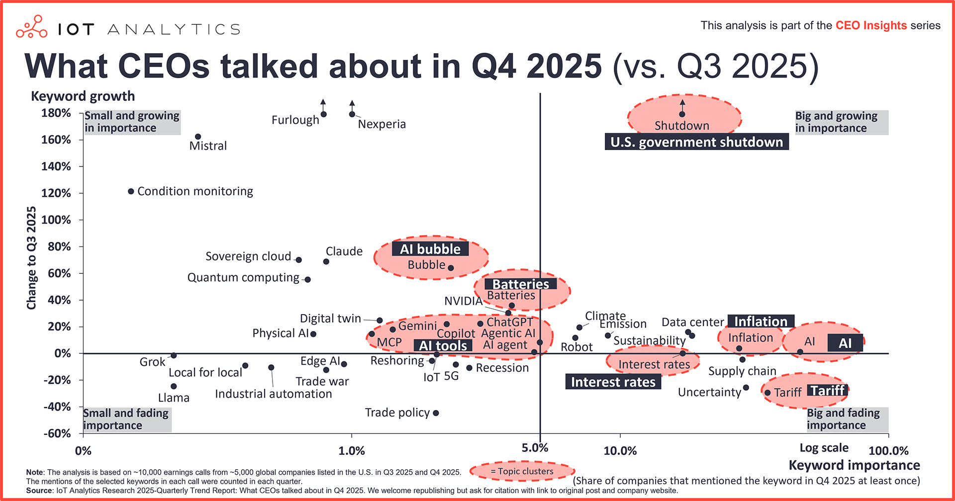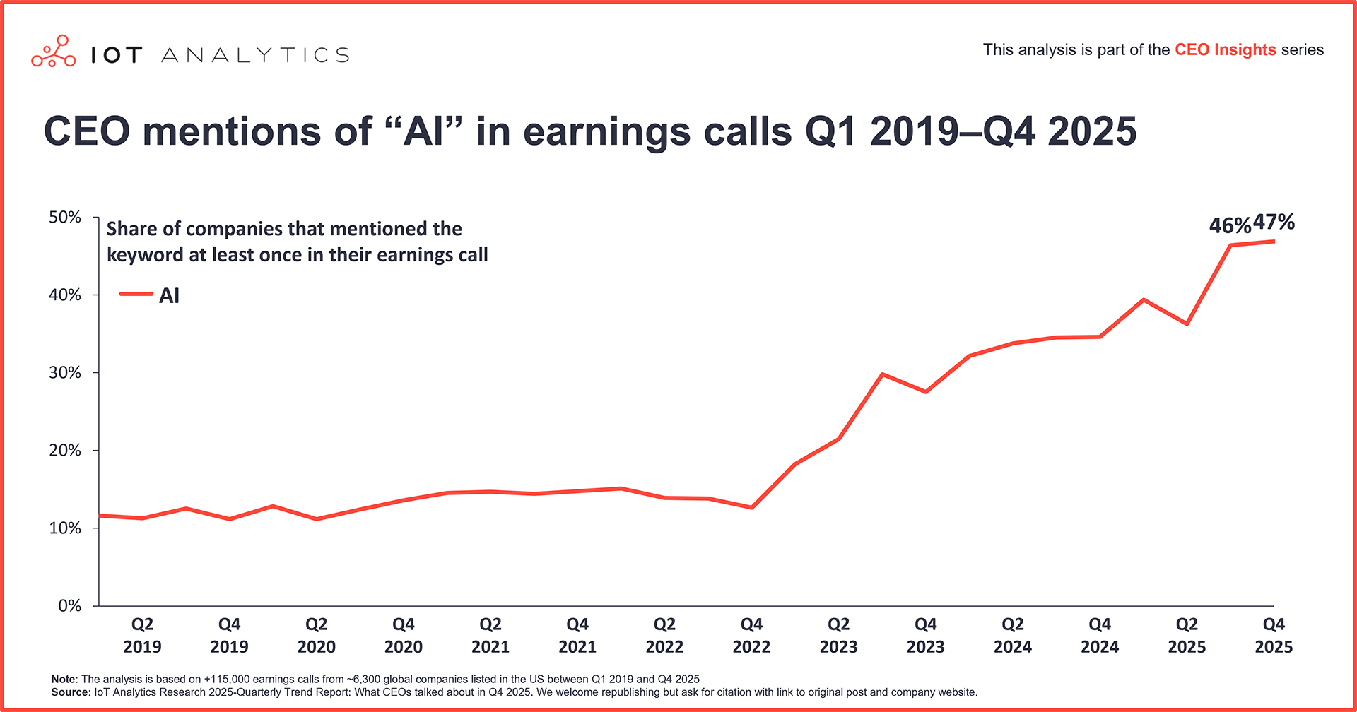 The Quarterly trend report: What CEOs talked about in Q4 2025 is part of IoT Analyticsโ ongoing coverage of the IoT and related technology markets. The information presented in this report is based on a database of 115,000+ earnings calls of US-listed companies from Q1 2019 through Q4 2025. Every quarter, IoT Analytics analyzes trends emerging from earnings calls and presents findings for the most recent quarter. The purpose is to inform other market participants about the current focus of CEOs and companies. To ensure objectivity, IoT Analytics did not alter or supplement any results and did not deliberately exclude any earnings calls.